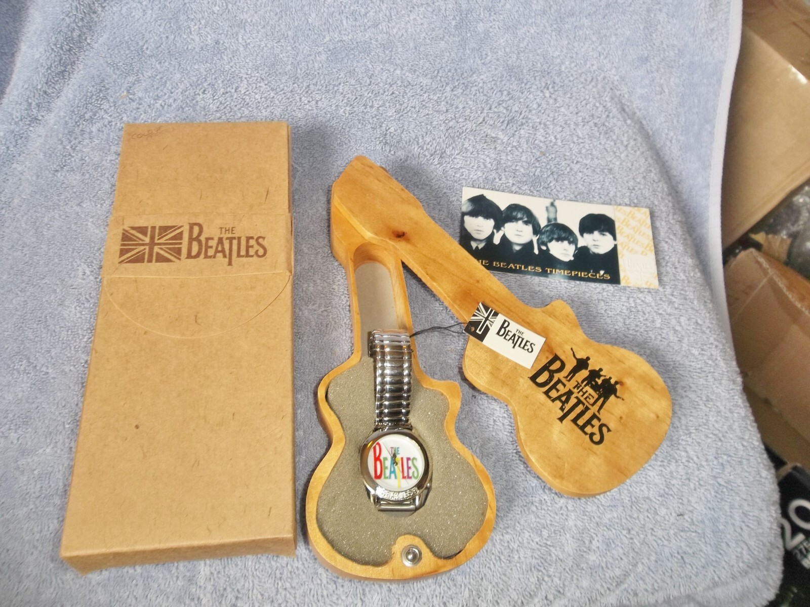 THE BEATLES OFFICIAL APPLE WATCH WOODEN GUITAR CASE COLOURED BEATLES. BRACELET