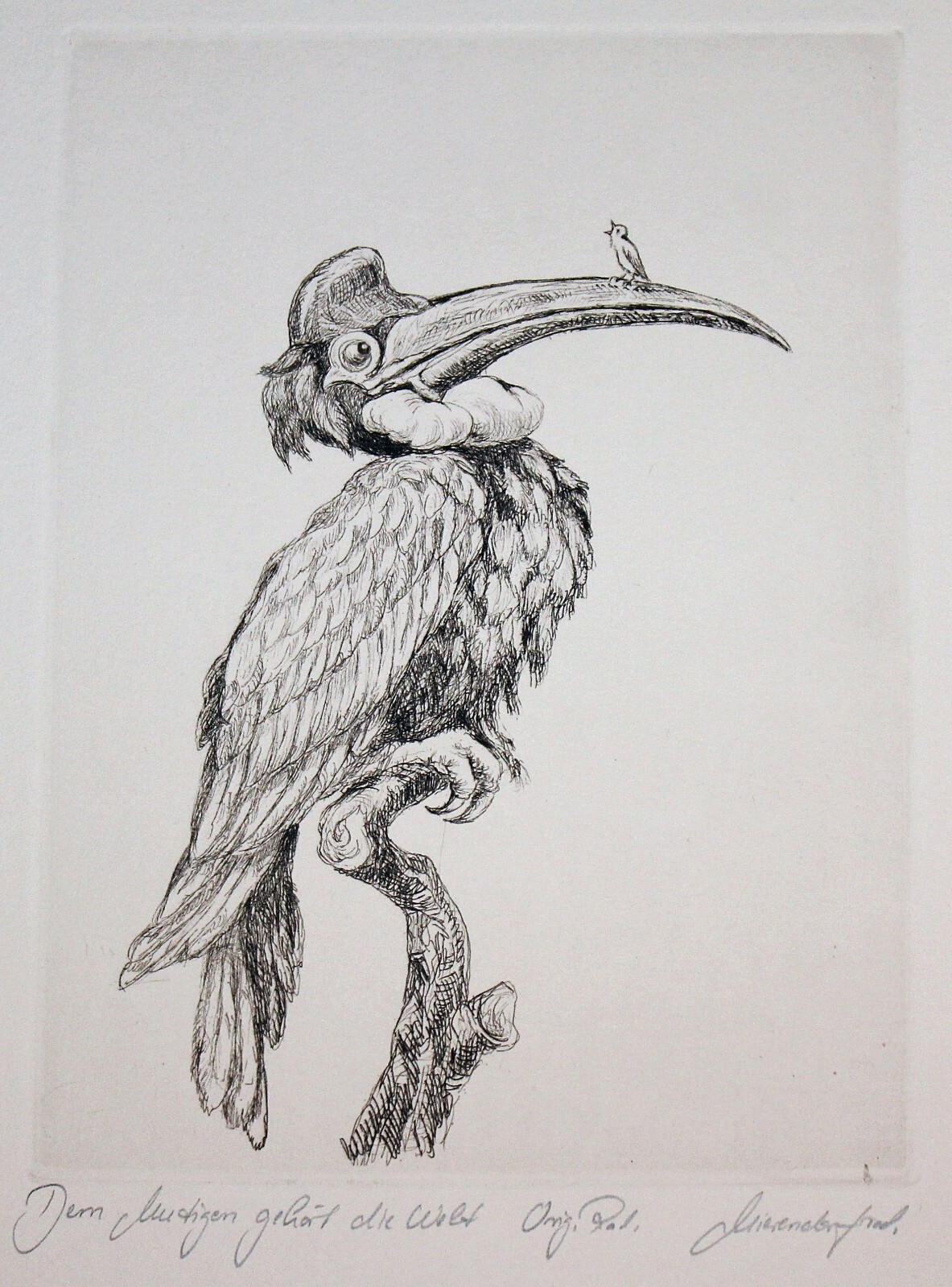 " Dem Mutigen gehört die Welt " ,Original Radierung ,ich Denke das es sich um einen späteren Nachdruck von der Original Platte handelt ,das genaue Alter dieses Druckes und der Künstler ist mir nicht bekannt ,die Radierung ist im gebrauchten Zustand ,das Blatt ist ein wenig angegilbt ,im Randbereichen (auf den hellen Randstreifen ) des Blattes sind umlaufend Teilweise deutliche Knick - und Wellenspuren vorhanden ,Größe des Motives : 13,5 x 18,5 cm ,Blatt Größe : 24 x 30 cm.