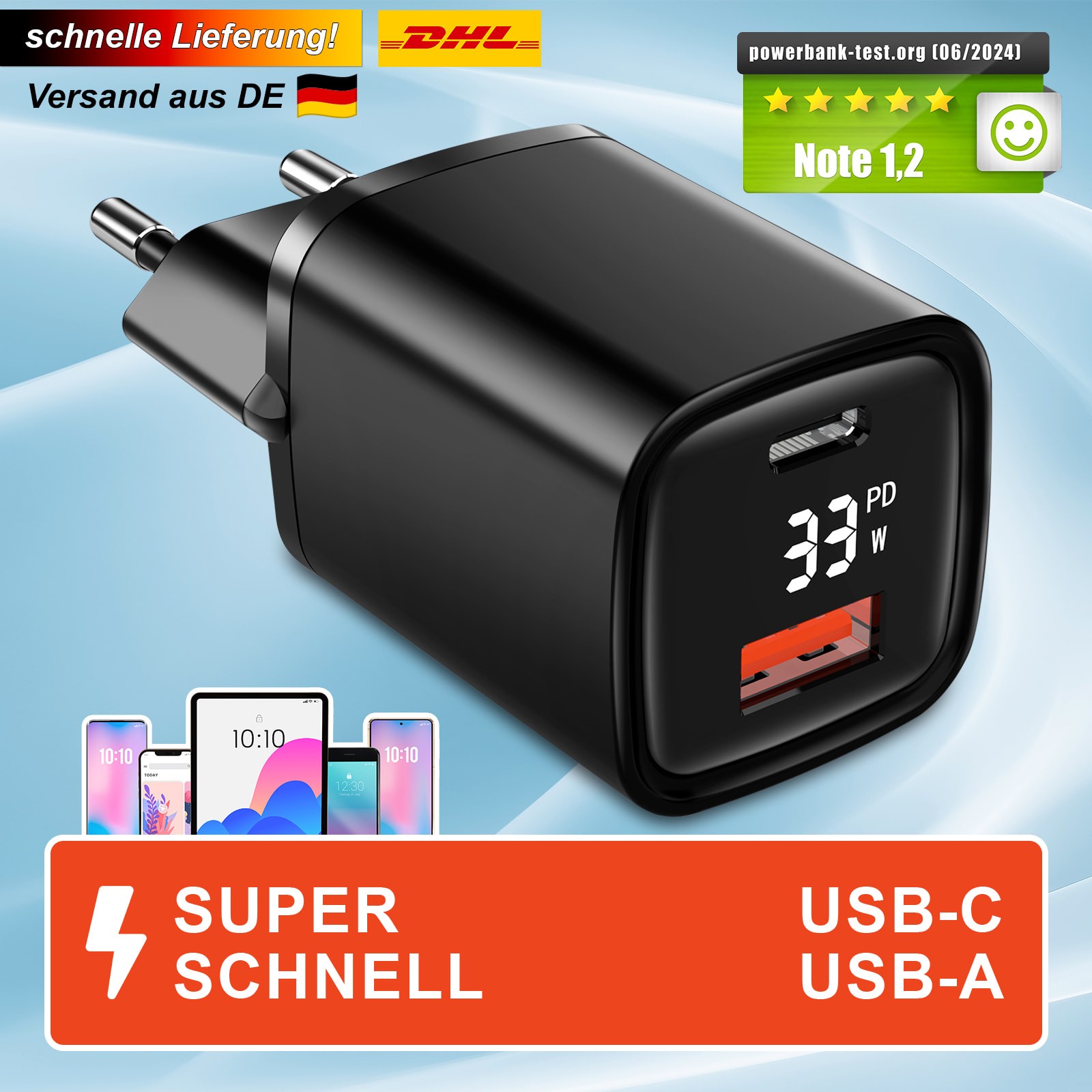 Dual Schnellladegerät mit Display USB-A + USB-C Netzteil 33W Adapter für iPhone