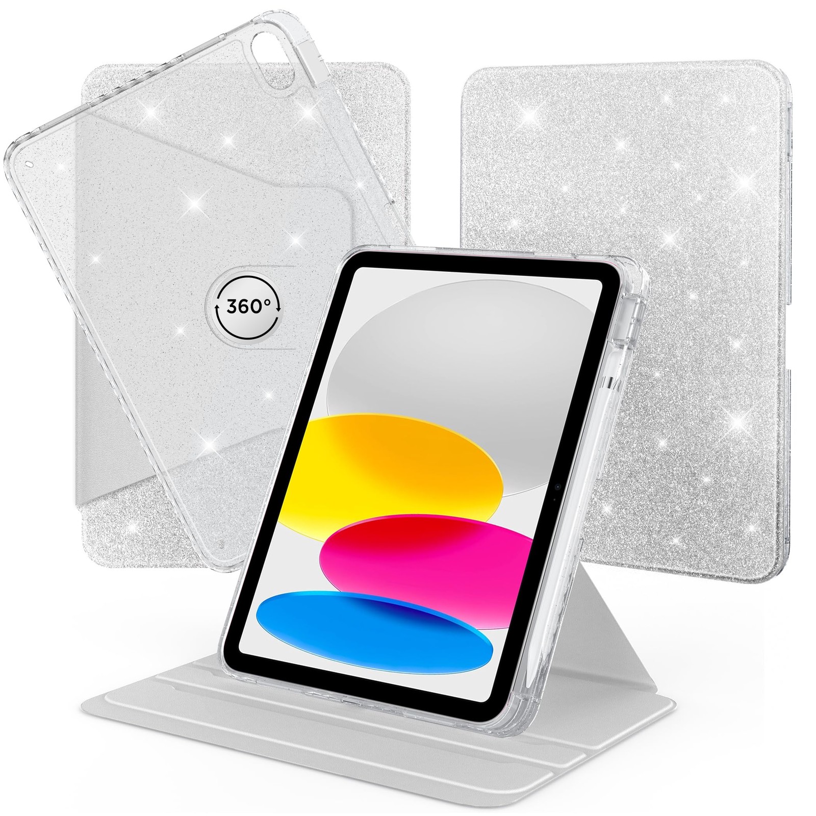 CACOE 360 Rotating Case for iPad (A16) 11th/10th Generation with Pencil Holder 2025/2022 11/10.9 inch, Shockproof Cover for iPad 11/10 Gen with Stand, Sparkle Silver