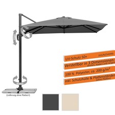 Produktdetails: Funktionen: neigbar, per Drehteller mit Fußpedal um 360° drehbar, Farbe & Material: Farbbezeichnung: anthrazit, Material Gestell: Aluminium, Stahl, Materialzusammensetzung: Obermaterial: 100% Polyester, Maße & Gewicht: Breite Schirm: 300 cm, Länge Schirm: 300 cm, Breite Standrohr: 53 cm, Tiefe Standrohr: 80 cm, Gewicht: 30,4 kg, Hinweis Maßangaben: Alle Angaben sind ca.-Maße., Höhe gesamt: 264 cm, Hinweise: Aufbauhinweise: Selbstmontage mit Aufbauanleitung, Hinweise: Schirm bei aufkommenden bzw. spürbarem Wind schließen, Pflegehinweis: Bespannung abnehmbar für Handwäsche, Lieferumfang: Sonnenschirmständer, Schutzhülle