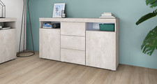 Maßangaben: Breite: 200 cm, Tiefe: 35 cm, Höhe: 72 cm, Hinweis Maßangaben: Alle Angaben sind ca.-Maße., Farbe: Farbbezeichnung: weiß Hochglanz/weiß Hochglanz, Wissenswertes: Wissenswertes: Dieses elegante Sideboard ist ein echter Hingucker! In tollen modernen Farbdekoren bietet es viel Platz für Ihre persönlichen Dinge. Die drei Türen mit Metallscharnieren und die drei Schubkästen auf Metallkugelauszügen werden bequem mit der Push-To-Open-Funktion geöffnet. Über den Türen befinden sich offene Fächer, bei denen eine Unterbaubeleuchtung Platz findet. Beleuchtungen sind nicht im Lieferumfang vorhanden. Bei der Graphit-Variante sind die Türen im Farbton Graphit und die Schubkastenfronten in stahlfarben grau. In folgenden Farben erhältlich: : Korpus/Front: weiß Hochglanz/weiß Hochglanz, Korpus/Front: Beton-Optik, Korpus/Front: schwarz matt. Details: : 3 Türen, Fachinnenmaße außen (B/T/H): ca. 2x 50/31/46 cm, Fachinnenmaße mittig (B/T/H): ca. 1x 45/31/46 cm, 3 Schubkästen, Schubkasteninnenmaße (B/T/H): ca. 41/29/10 cm, 2 feste Holzböden, 3 verstellbare Holzböden,