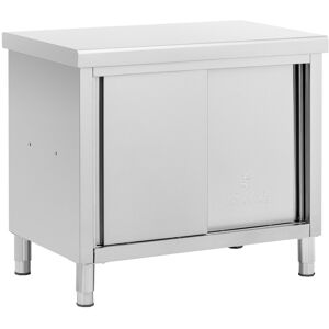 Ob in Restaurant, Kantine, Hotel, Bäckerei, Krankenhaus oder Großküche: Edelstahlmöbel bilden die Grundlage für einen hygienischen Umgang bei der Verarbeitung von Lebensmitteln aller Art. Der Arbeitsschrank mit Durchreiche von Royal Catering gehört in jede professionell eingerichtete Küche und entspricht speziell den hohen Anforderungen in der Gastronomie. Der Durchreicheschrank ermöglicht den schnellen Zugang von beiden Seiten und somit den einfachen Austausch von Küchenutensilien aller Art. Das Modell steht auf stabilen Füßen, die Sie bei unebenen Böden für einen sicheren Stand um bis zu 20 mm anpassen. Die 200 x 70 cm große Arbeitsoberfläche des modernen Edelstahlschranks bietet Platz für Ihre tägliche Arbeit mit frischen Lebensmitteln, Zutaten und Küchengeräten. Die geniale Kombination aus einer mit MDF verstärkten Arbeitsfläche und einem Aufbewahrungsschrank ermöglicht vielfältige Einsatzmöglichkeiten und sorgt spielend für Ordnung in Ihrer Küche. Ausgestattet mit vier leichtgängigen und flüsterleisen Schiebetüren bleiben die im Inneren untergebrachten Utensilien sicher und sauber verstaut. Dank dieser passt der Schrank zudem ideal in kleinere Küchen. Der Innenraum ist durch einen stabilen Einlegeboden unterteilt, der für eine übersichtliche Anordnung sorgt. Die Gesamttragkraft des Gastro-Arbeitsschranks liegt bei maximal 500 kg. 300 kg davon entfallen auf die verstärkte Arbeitsplatte, während die unteren Ablagen jeweils 100 kg Last tragen. Hergestellt aus hochwertigem Edelstahl besticht der Arbeitsschrank durch seine hohe Widerstandsfähigkeit, garantiert eine lange Lebensdauer und ist beständig gegen Korrosion sowie mechanische Beschädigungen (z. B. Kratzer). Das pflegeleichte Material reinigen Sie unkompliziert. Es erfüllt so perfekt die Voraussetzungen für ein hygienisches Arbeiten mit Lebensmitteln.